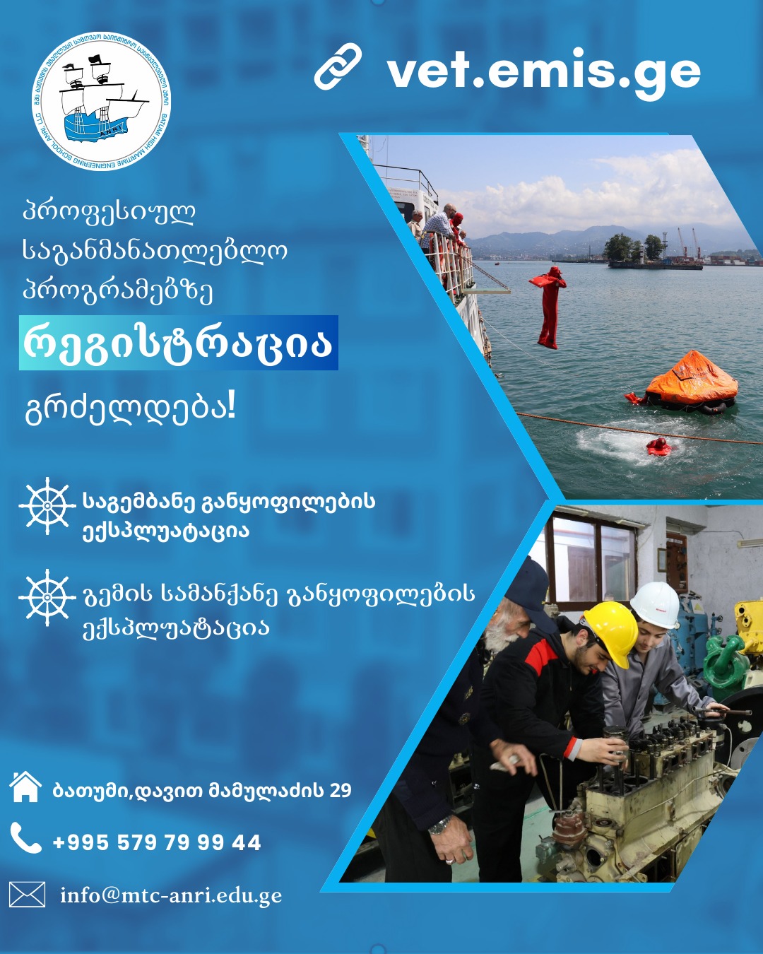 ავტორიზირებული შპს “ბათუმის უმაღლესი საზღვაო საინჟინრო სასწავლებელი ანრი“ აცხადებს საბუთების მიღებას უმაღლეს (ბაკალავრიატი) საგანმანათლებლო პროგრამებზე სპეციალობებით: 1. „საზღვაონავიგაცია“; 2. „გემისმექანიკა“.